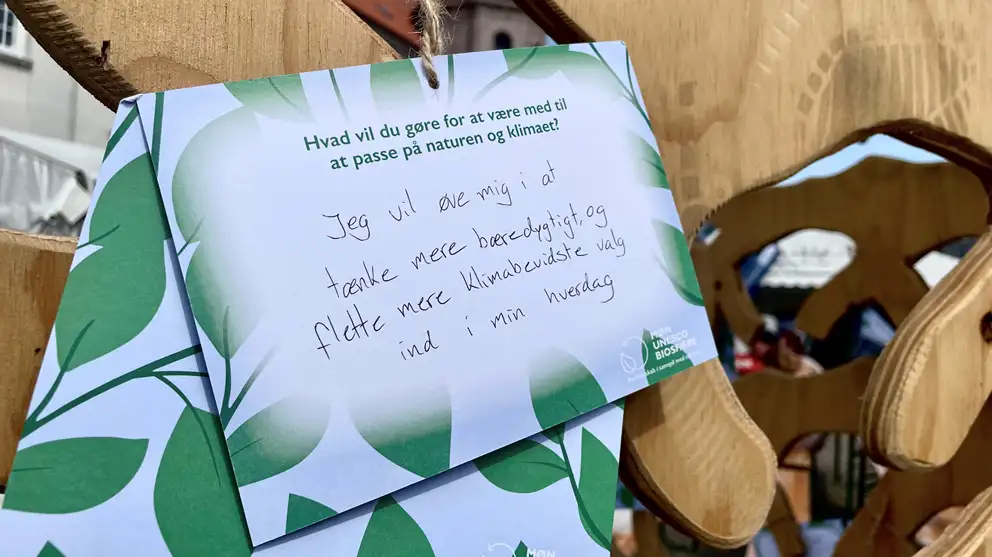 Begge dage var biosfærekoordinator Katrine Dietrich på Torvet klar til dialog og refleksion over, hvordan vi alle kan gøre noget godt for at passe på naturen. Også begge dage stod 'Biosfæretræet' på torvet og alle blev opfordret til at give et bud på, hvad man vil gøre for at passe på naturen, og hænge det på træet. Det gav anledning til mange fine dialoger og mange gode bud på handlinger. Vi har samlet alle input i en 'ordsky'.