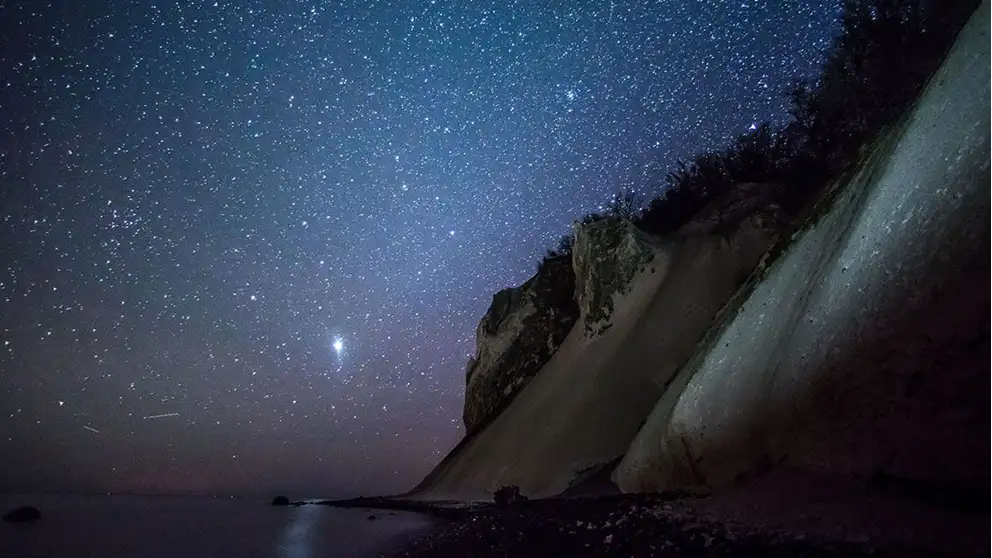 'Du sidder i båd under stjernerne. Karlsvognen ligger på kanten af Møns klint, der fra søsiden mister sin højde op mod universets uendelige. Et soundtrack spiller, og natten går over i dag i den lyse forårsnat.'